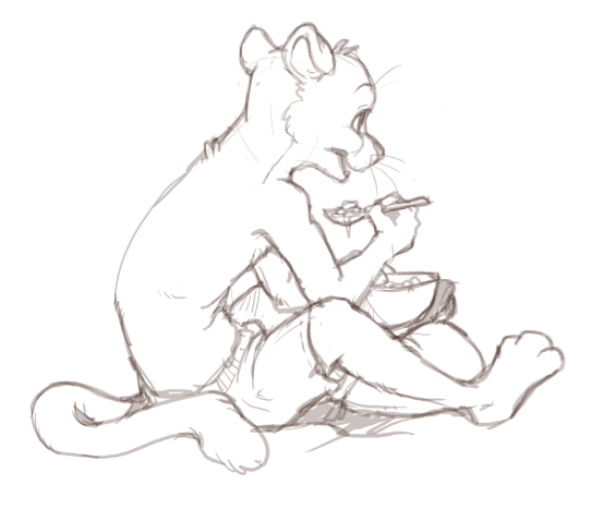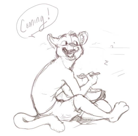 In the extra sketches you see how the drawing progressed. In the first one he's watching TV. I loved it a lot! But I was greedy and wanted to see his cute face better, so I told her 'make him have his head turned', and she took me so literally that she did it so he's still paying attention to TV while responding xD It's a very cute one too, but I asked her to let him be more placid, like... 'oooh, sure, I'll go, there's no rush in life', and she caught that feeling great in this expression.