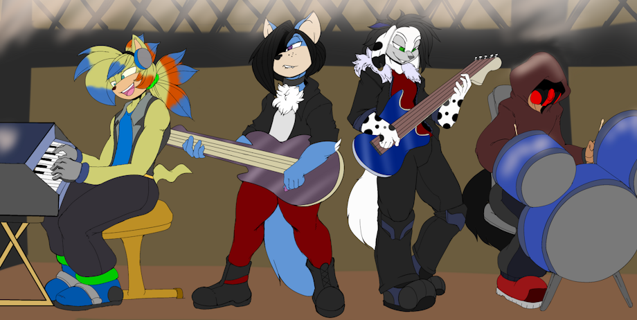 Art by the amazing :vibershot I got this from him a while back and never finished it. So there we have my character. From left to right. Ryan on piano, Rye on Guitar, Drew on Bass guitar and the masked drummer. All in that order. I cant decide on a band name for them, and a friend gave a few. Torrental Drift, Bask In The Glow and Harmonizing Legacy. I really cant choose the last one sound good, but then again they all do