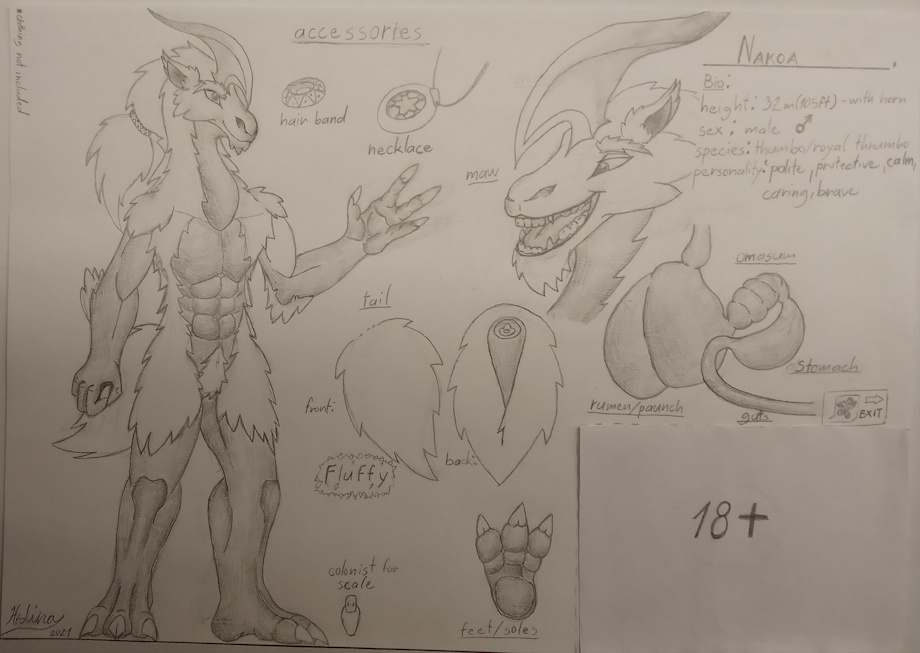 Born as a hybrid of a Common Thrumbo and also the Royal Thrumbo, Nakoa was gifted with exuberant strength, size and powers of nature & ice to protect his feral comrades against anybody who dares to hunt them for their meat and horns. But even as agiant guardian, Nakoa is a pretty chill guy (which can be sometimes also in a literal sense), who hangs out in the arctic biomes of the planet Rimworld and even is willing to help tend to some colonists in need who crashlanded on his homeworld; either by his mentioned strength or by sharing some rare commodities like the thrumbo wool (including his own), or the famous delicacy: the milk from the royal thrumbo's females. Also in a rare case: Nakoa is willing to keep warm any unlucky explorers who managed to get themselves lost in the tundra. This can be done by putting the explorer under a part of his folk costume or covering them into his fur (and even using methods which nobody could say to a herbivore). So, Nakoa is a terror for the hunters and bandits, and as a friend for any kind being.