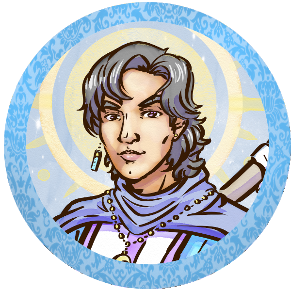 hahahaha He's fresh out of the House of the Moon in Waterdeep, so is a Selune believer. Though unbeknownst to him, he's not human but actually Kalashtar. >:3 I mostly wanted to play a kinda wimpy rich kid being forced into manual adventuring hahahaha