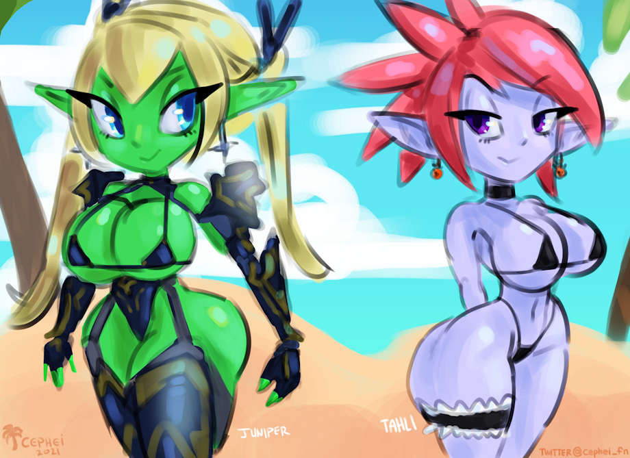 I wanted to do a sketchy doodle where I have my two shortstacks together in one image. I chose the beach as a setting because it's quick to do and it's summer time once again. Eventually Tahli's just going to rip all that armor off of Juniper. It's getting way too hot!