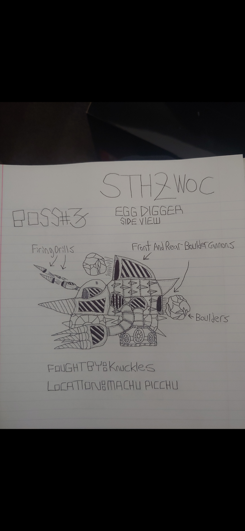 Robotic Mole Mech with built-in front and rear boulder cannon that shoots out boulders that Knuckles can either punch through or fling it right back at him, spiked wheels 2 cling onto mountainside and rocky walls