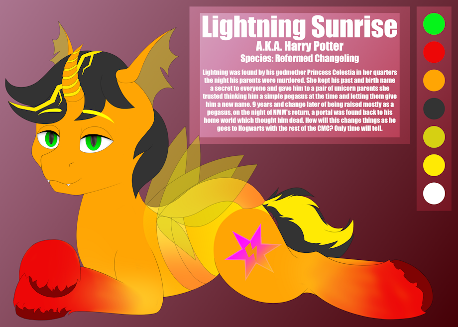 This is how Lightning Sunrise (birth name being Harry Potter) truly looks over in Equestria in my HP/MLP:FiM crossover fanfiction. This would be post the prologue book. You can also see how reformed changelings look like in my AU. Art was drawn by the wonderful Str1ker878 on DeviantArt.