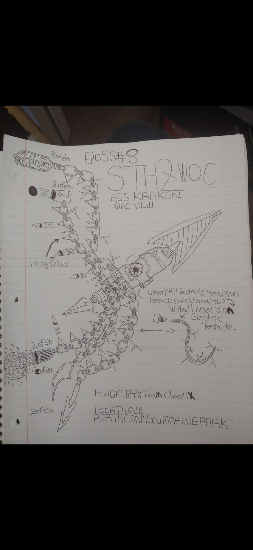Created 4 sole purpose of replacing his Mako Shark Mech, Egg Thrasher should it ever gets destroyed with tentacles made out of Electricity but is protected by spiked armies and twin pairs of diffrent weapons at the end that can be destroyed.