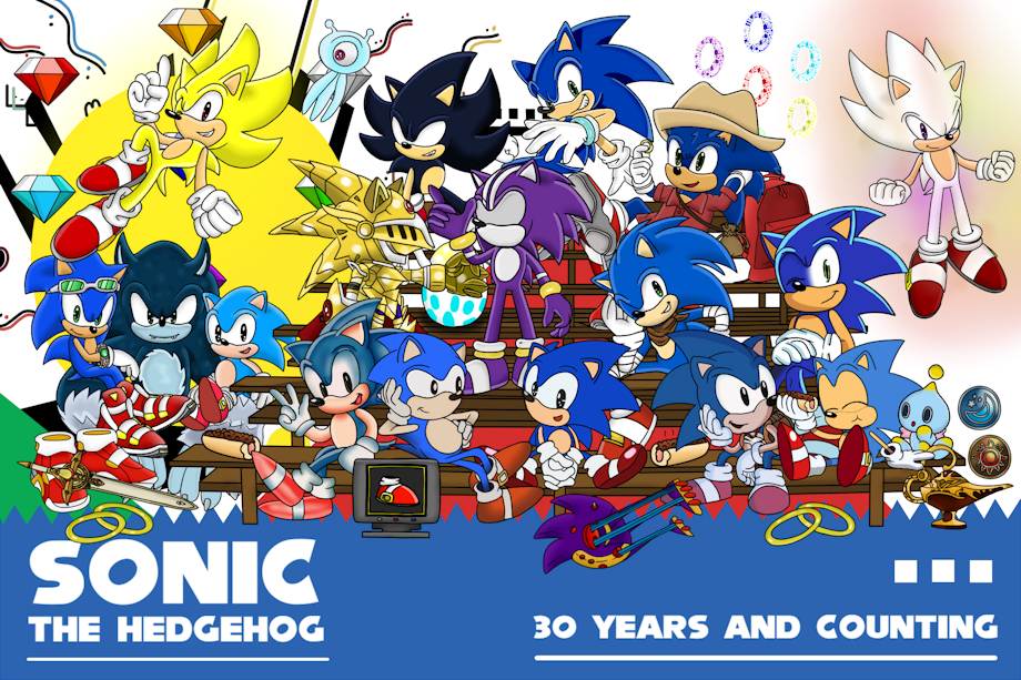 For this picture, I wanted to combine as many of Sonic's variants/ as possible. Even though I haven't drawn EVERY type, I made sure to add objects/props which are related to a particular game and/or version of Sonic.