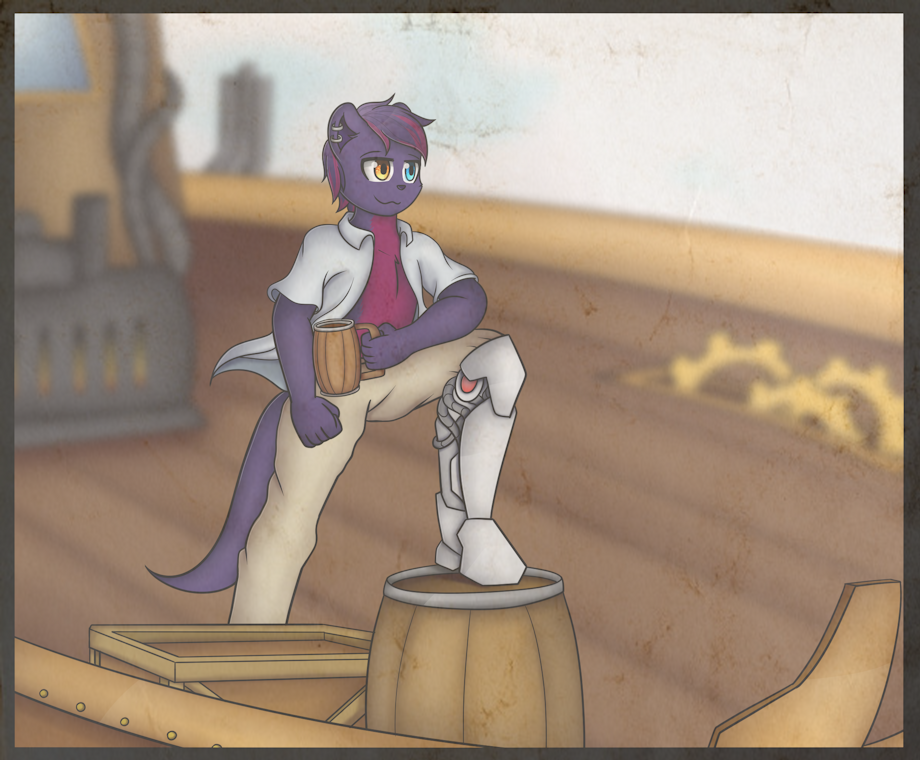 Silver Fang, my otter pirate, chillin on his airship and having a mug of Rum