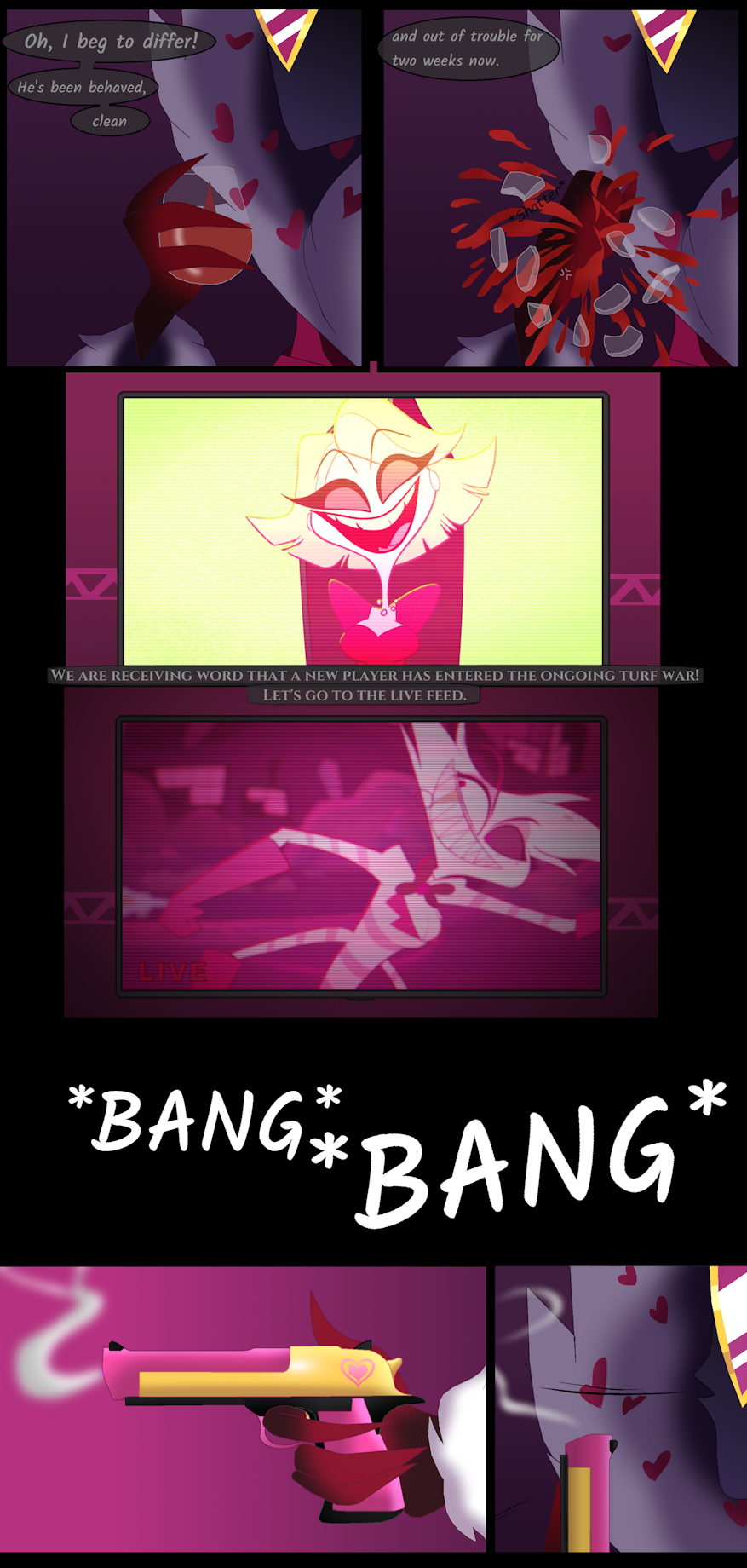 The images on the TV are screenshots from the Hazbin Hotel Pilot Episode.