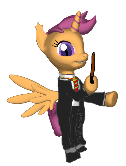 This is Pegaling Scootaloo recreated in PonyLumen so I, Teraunce, could pose her. I then saved the picture produced and added the Hogwarts Uniform and shading to it to create this image.