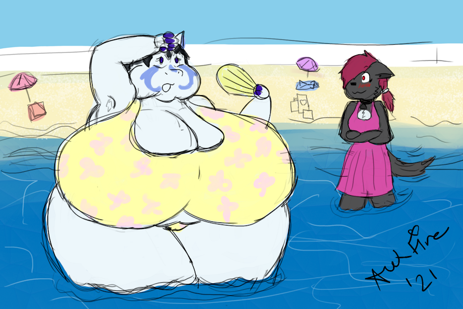Here, we have a sketch commission for BecCallow, featuring their VERY thicc character, a Kanjuri named Gigga, She's out in the shallow waters of this beach on a very hot day, trying to cool off. Meanwhile, a nearby local fur has taken notice of the cute girl in a swimsuit in the water, and is nervously approaching.