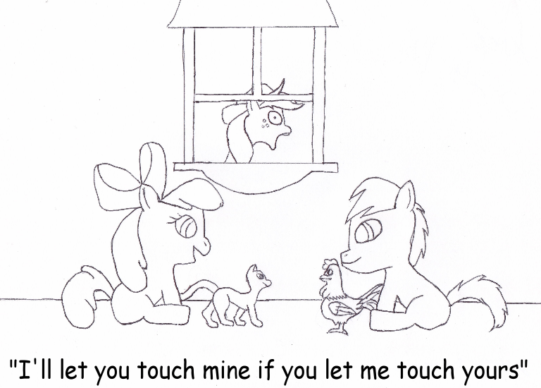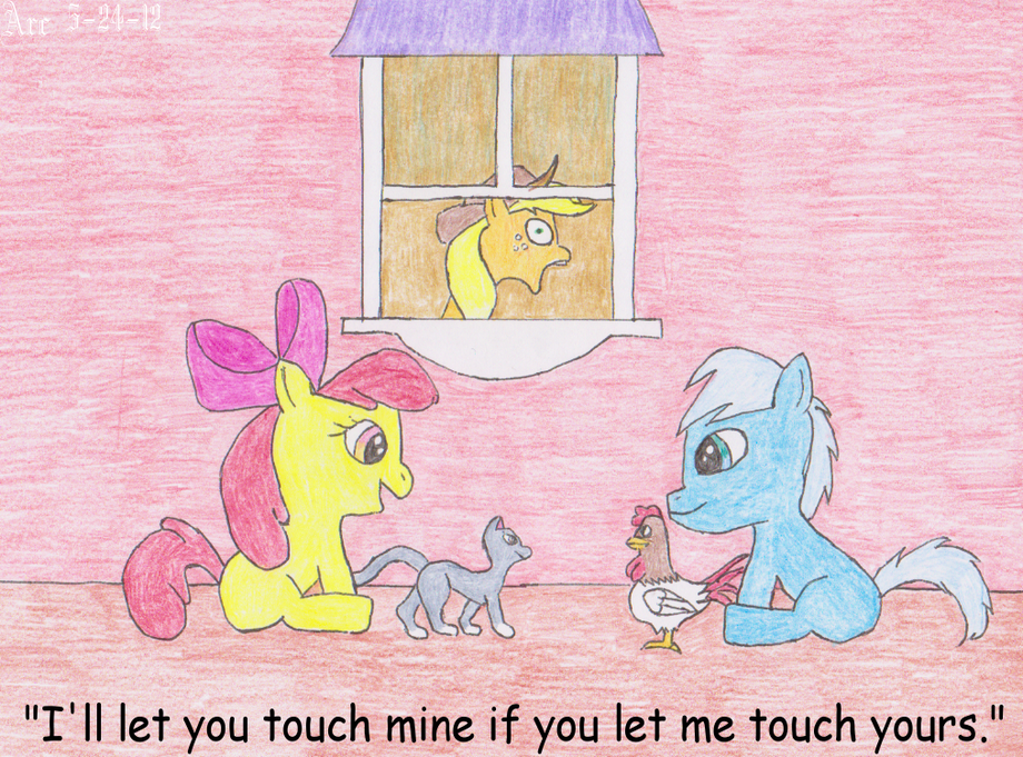something i did for the upcoming issue of PlayBrony https://playbrony.deviantart.com/ (yes we are going to make the spoof magazine a reality) a little bit of comedy dealing with the old joke of cocks and pussy's. AppleJack is not pleased at what lil ole Apple Bloom is suggesting. i mean she's too young to let anypony touch HERS tsk tsk. no idea who the colt is I needed a male her age and was a bit too lazy to go referance one from the show.