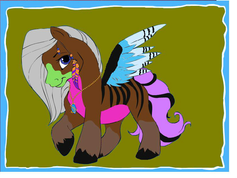 teal green beak,gray or baby blue mane,brown body,purple belly and tail, tail has brown stripes gray poof fur on end of tail, mane color gos to rump with brown rump and leg stripes, black markings on face, black tips on ears, inside ear match mane, wings are black at the top, sky blue on the middle feathers,and gray with black stripe on bottom feathers,two long feathers come off the back of head they are purple and orange striped with a black eye on the tip (like a peacock feather has.