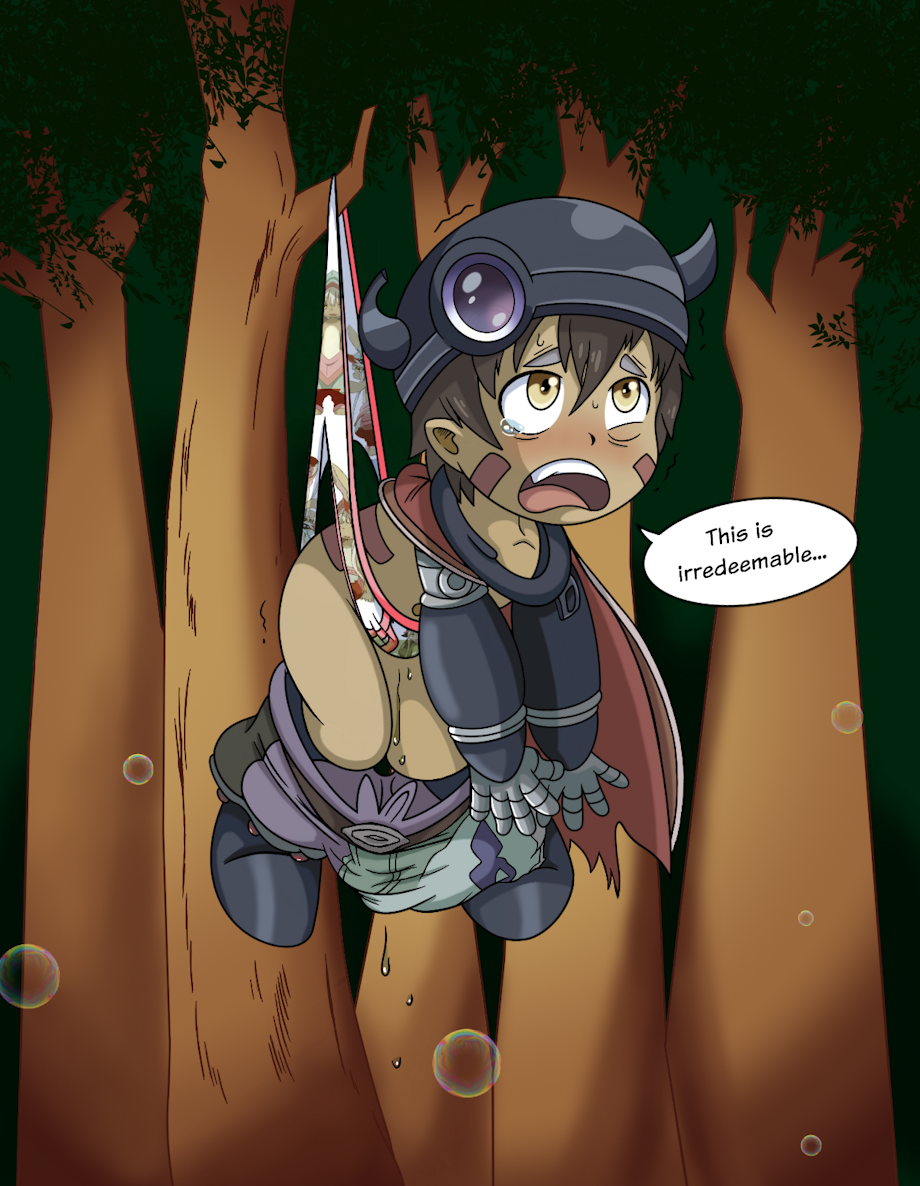 Poor Reg's foot slips while going down into the the Abyss and he is saved by a branch getting stuck into his Nanashi underwear, giving him a massive hanging wedgie. His pants slips down and the strong wedgie and the sudden pain makes him wet his underwear. He can only blush and mutter to himself in shame...