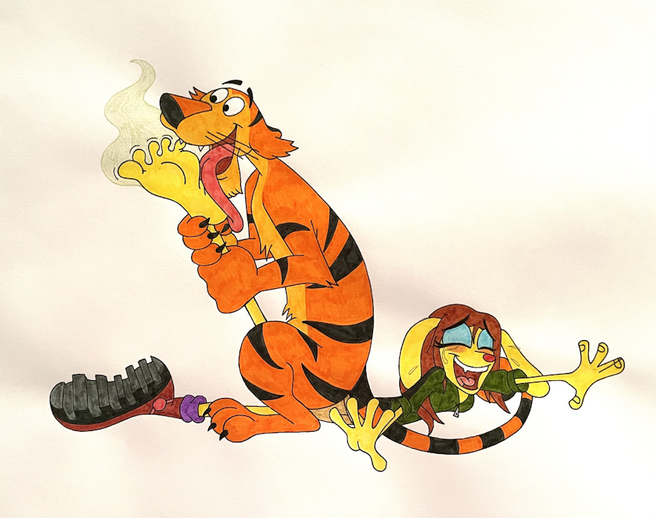 Eventually, it was about 30 minutes before Katie was allowed to go home and an hour before the place opened. Katie was slightly exhausted from running around with Raja to make sure he was ready for the day. Raja laid down in his grassy bed, eating the meat from the food bowl as Katie laid against his side, sweating a little. "Whew......my god, that was a lot of work to do for one simple tiger." she yawned a little bit. "I'm sure I'll get into the swing of things when I do it for a couple of days more." she said. Raja looked over at her, and noticed her shoes. She was slightly swaying them back and forth as she was resting. He thought for a second, with a look on his face which probably said "Hmm....I'm sure she wouldn't mind if I played with them. After all, she took care of me. I should do the same." he thought. and immediately, Raja got up and moved, making Katie's head fall gently onto the grass bed. "Oof! Raja, what are you doing?" Raja nudged her onto her belly, and sat down right on her back, gently. "What ar----oooh, I get it. Heh heh heh. Yeah, now I understand. Well, it has been a really long time since I've let you do it anyway. Alright, go ahead." she said. Raja was very excited. He grabbed her left foot by the ankle and lifted her foot up. She was slightly nervous, not having felt his scratchy tongue in forever, so she wasn't used to the feeling. Raja grabbed her shoe gently, and pulled it right off, revealing her stinky socked foot underneath, wiggling lightly with the breeze hitting them. He smelled the inside of the shoe before setting it aside, and taking a very long sniff of her socked foot. The rushing of air made Katie giggle like a young schoolgirl. Raja spent a good amount of time sniffing her sweaty socked foot, until he wanted more. He slipped her sock right off and tossed it aside, revealing her smelly stinky foot. She wiggled it more as the wind went between her toes. Eventually, Raja started giving nice long sniffs again, making Katie wiggle her toes and laugh softly. "Hohohoho! Not the sniffing! It's still just as bad!" she said. Eventually, Raja was ready for the main course. He started taking long licks of her dirty sweaty foot, running his tongue up and down her sole. Katie twitched and splayed her stinky toes upon contact. The scratchiness of his tongue sent the teenage girl into a frenzy, as she started crying with laughter, pounding the soft grass bed she was stuck in. "HAHAHAHAHAHAHAHAHAHAHAHAAHAHA! NOHOHOHOHOHO!" She laughed and laughed for a solid 15 minutes, before Raja did the exact same thing to her right foot to savor the fresh smell, and eventually, licked each of her toes on both feet. But eventually most fun things had to end, because Carter came back, ringing the bell for Raja to go into the exhibit for people to see him. He sighed, wanting to continue, but he knew he had to go, so he set her feet down, licked her cheek, and walked through the door to the exhibit. Katie looked up, her face red and covered in tears from laughing, her feet red and saliva covered. “*whistles* This place is brand new and now it smells like-” “Stinky feet, I know.” Katie chuckled, catching her breath. Carter couldn’t help but smile as Katie lied down there. “You sure had fun, I can tell.” She heard her phone ring and picked up. "H.....hello?" she said, out of breath. "So, how did it go? Did you have fun?" she heard Scuddy say on the other side of the phone. "I......I think i'm gonna lengthen it to 3 or 4 hours instead of 2....." Katie said, before she hung up, and laid her head back down to rest. “This job....is going to be the best job ever. That tiger is ooooone lucky guy.”