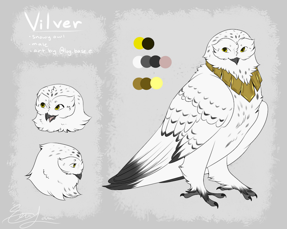 Black spots on back of the wings, tail and a little on the legs. A little blacks spots on his belly. Black claws and a golden necklace on his neck, covering a little part of his chest