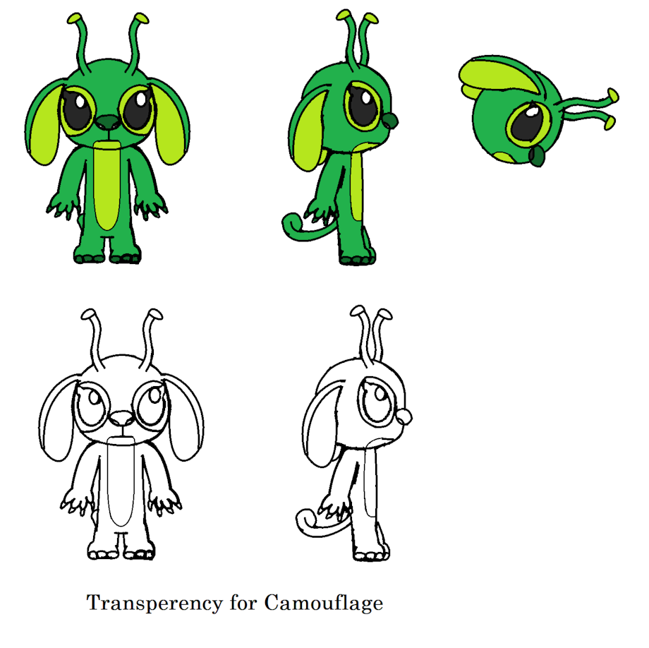 Created a new Stitch experiment oc. Was planning on making one after a friend but this one came up from the drawing board. Here's Cammy, nicknamed because of her Chameleon-like appearance and ability to camouflage.