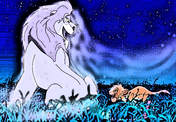 An what if scenario of young cub Simba being reunited temporarily with the spirit of his late father Mufasa and they are playing together for a short while. Simba and Mufasa are owned by Disney.