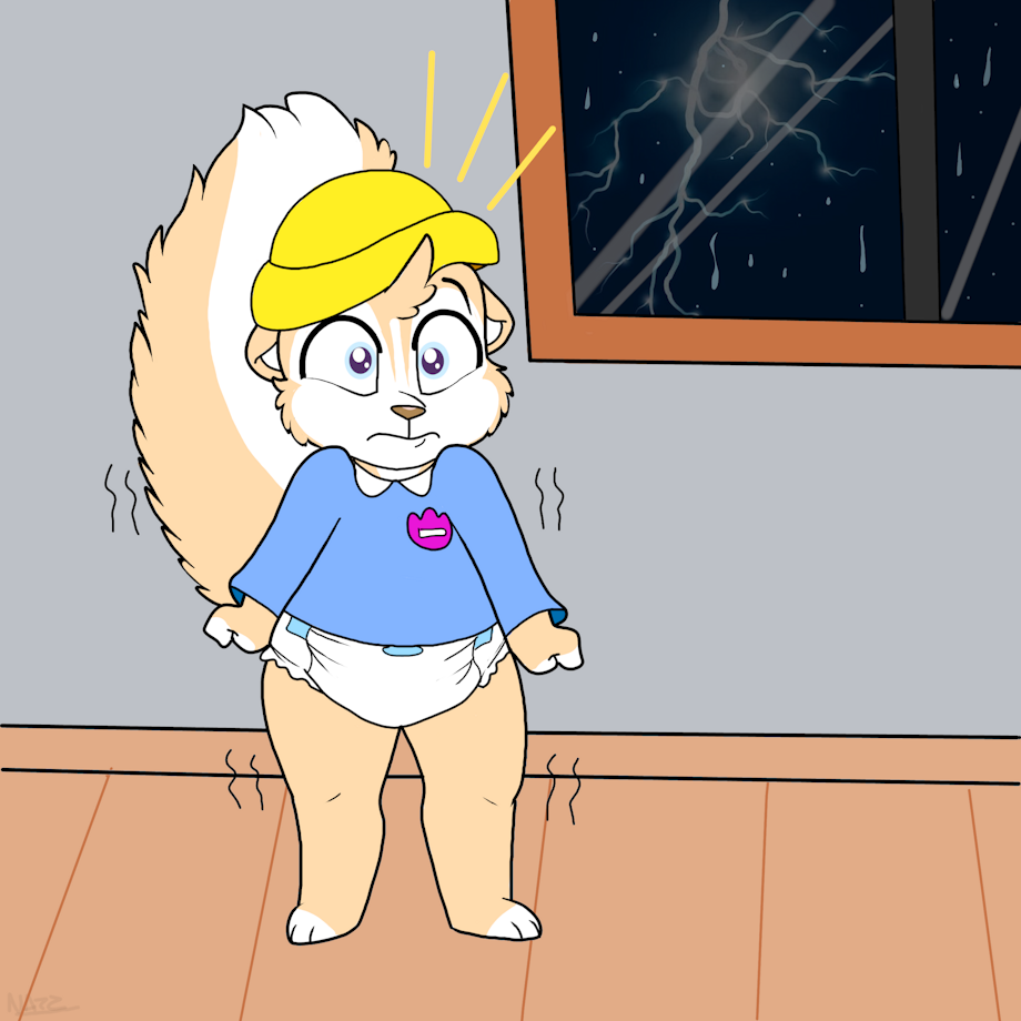 Theodore getting spooked by the loud lightning storm from outside the window as he wets his diaper