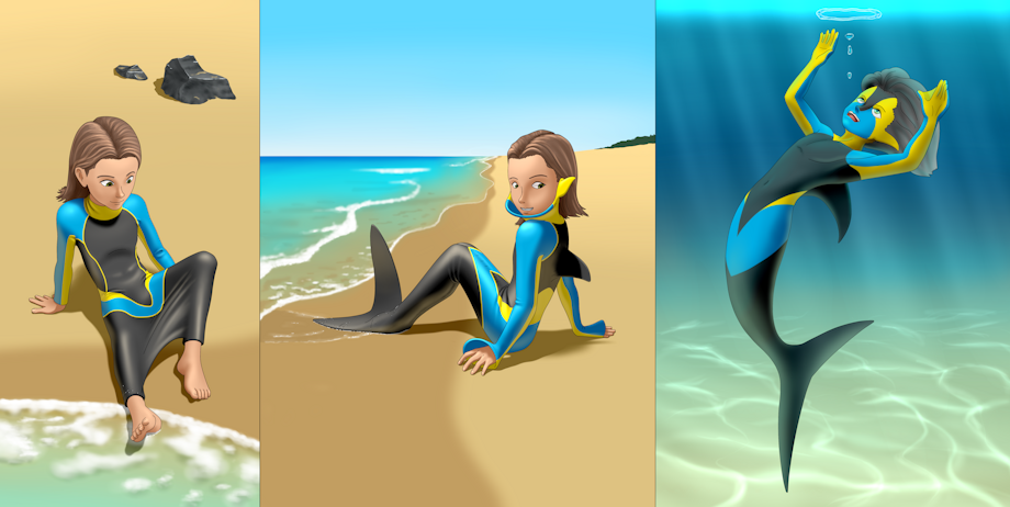 Another one! A bunch of others can be found in my gallery. Each transformation has been unique so far, and this one is too. This time the transformed keeps their human face, though his nose go a little sharper! And his legs transformed completely, giving him a proper singular tail. Also unlike the others, this transformation takes place out of the water. Well, the suits begin to transform on the wearer upon contact with salt water, so a little splash from the wash on the beach is all that was needed. I imagine his father wanted to take him scuba diving and fishing, and joined him in the same form, to do both at the same time. I might sketch a scene of him taking a selfie together, for my patrons.
