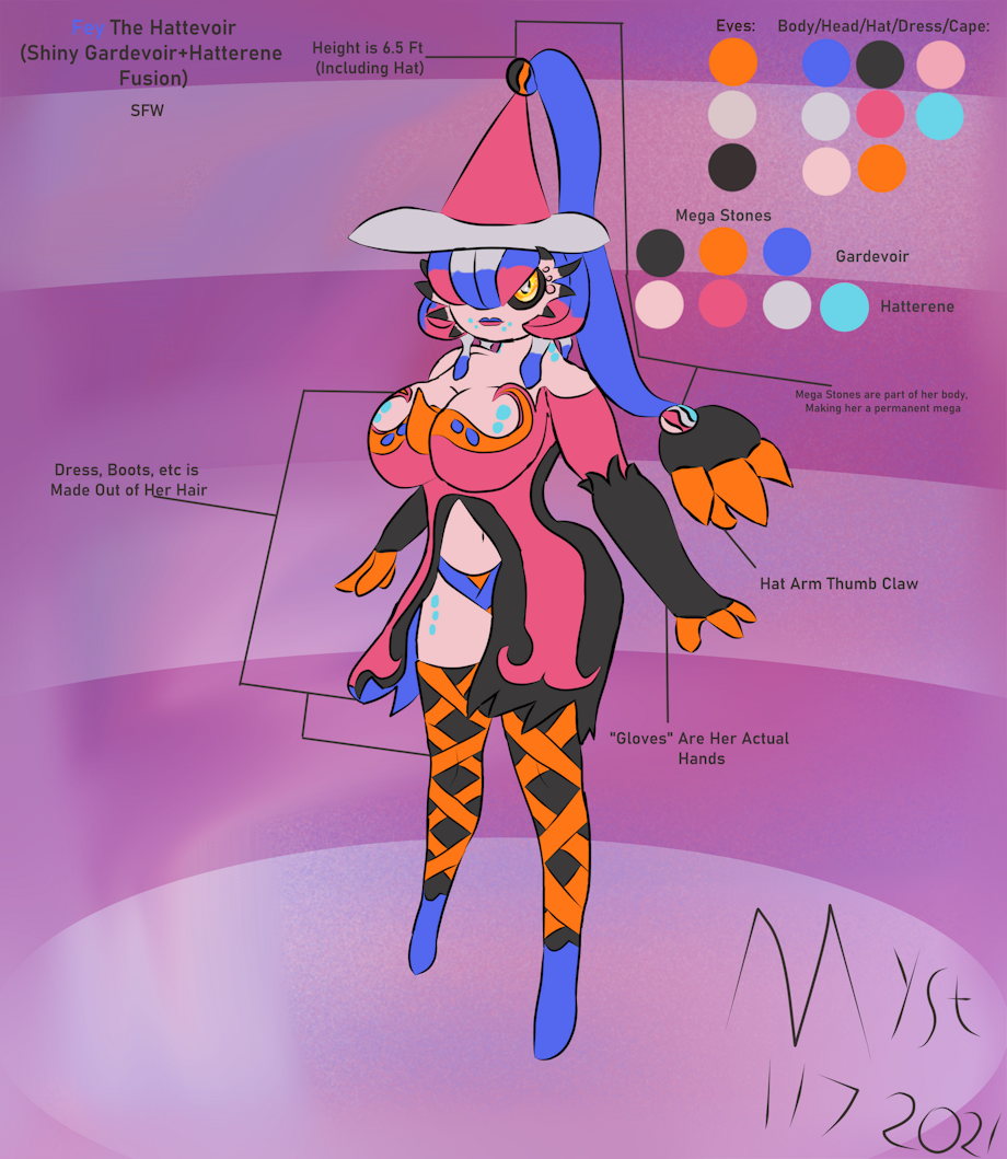 Hat is part of her body with 2 mega stones affixed to both the base and "wrist" of her hat arm, Glasses when she wants to look more appealing.