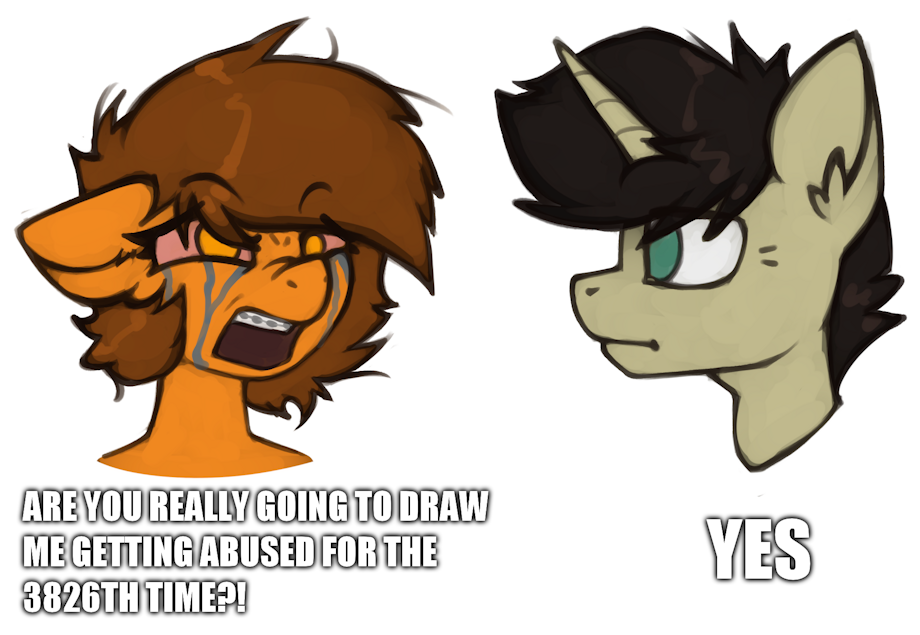 "Please stop making everycreature abuse me all the time! It hurts so bad..." "Suck it up, it builds character. Also, it's my fetish. Now, what should I draw you getting gang raped by next? Zebras? Griffins? Changelings? Hmm..." "Noooo... s-stop it please... I'll suck your dick..."