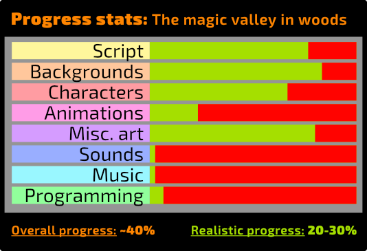 Also I introduce to you a progress stats table where I'll estimate the completion of each aspect of the current project. It's an "alpha"-version, so with more experience I will update the design to more precisely reflect the actual status of the development.