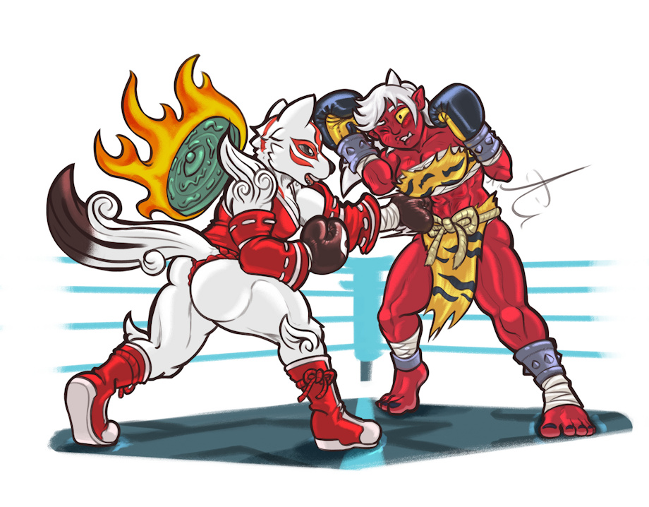 's rendition of Okami's Amaterasu beating up an Oni named Asuka.