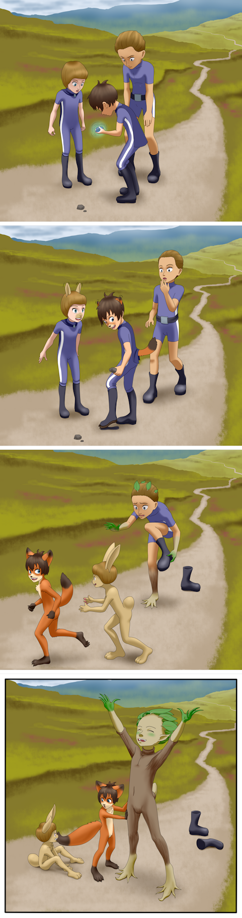 After this, the transformed trio did not report back, and when a team was dispatched to contact them, they avoided us and evaded capture. We eventually managed to capture the fox, and bunny with offerings of candy bars and other treats, but the tree boy was a little wiser than that. He is a surprisingly fast runner on those rooty feet. Over the terrain of rocky hills and thick heather, our other Agents couldn't keep up, in their boots. Now we're trying a different tack, and have set out a large pot full of fresh compost that we've enriched further with Miracle-Gro, in the hopes that he'll want to step in and... 'take root'. While we work on a cure, we've had to send the fox and bunny Agents to the petshop's training grounds. On the first day back, the bunny agent had been so ravenous with the chocolate rabbit and gingerbread people, that they were struggling to regenerate fast enough, while the fox Agent was caught trying to eat a former Agent turned chicken boy.