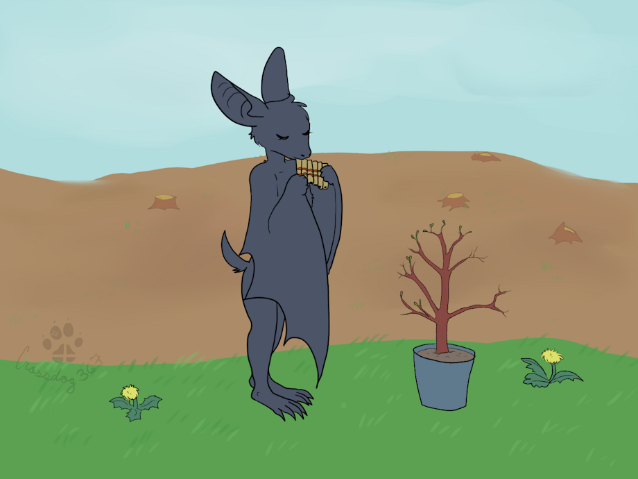 Part of a series of chat requests. I ask for a few general keywords and mash them into an image. I was asked to draw a happy little tree, serenity, and a bat.