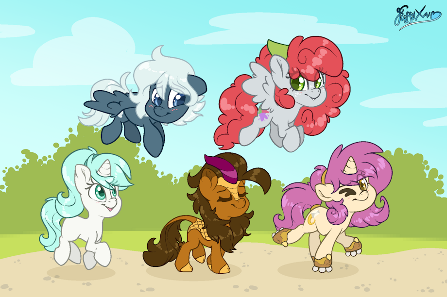 Another artfight, multi attack on a group of my friends from the MLPDS. From left to right: Nine the Divine's OC of the same name. Stratus, belonging to Cortawsome. Earthern Spark, belonging to JenniTheDragon. Scenic Spatter, belonging to AllyClaw. and Quick Glow, belonging to CutePencilCase. This was was time consuming but pretty fun.