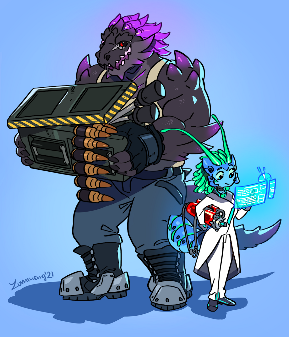 I drew some random soldier and scientist duo, the soldier coming from my friend's lizard race, and the scientist from my ensafir race. I tried to use my "bean" style, because I still want to practice it, because it's easy, quick, and I have a lot of fun with this style :) And somehow I feel this simple style is great for making concept arts for me, mainly because it's quick and easy.