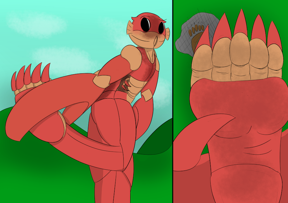 On one circumstance, he was walking along the grasslands just near the coast of the sea, leaving behind giant footprints in the trail. Normal stuff for a giant crab like he is. That was until he felt something strange touch the underside of his toes.