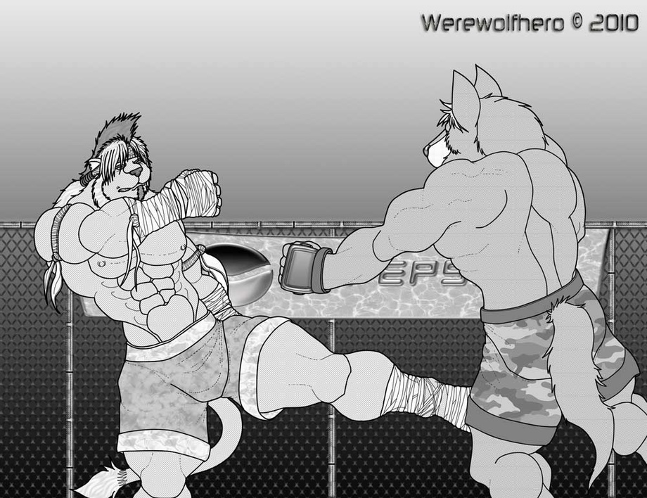 Radion and Rokarren going at it. Their personal grudge match grown so fierce the ref had to flee to the outside of the ring so not to get caught by Radion's Muay Thai or Rokarren's Kickboxing attacks, though thus far, they've been able to neutralize most of eachother's attacks, further drawing out the dangerous conflict.