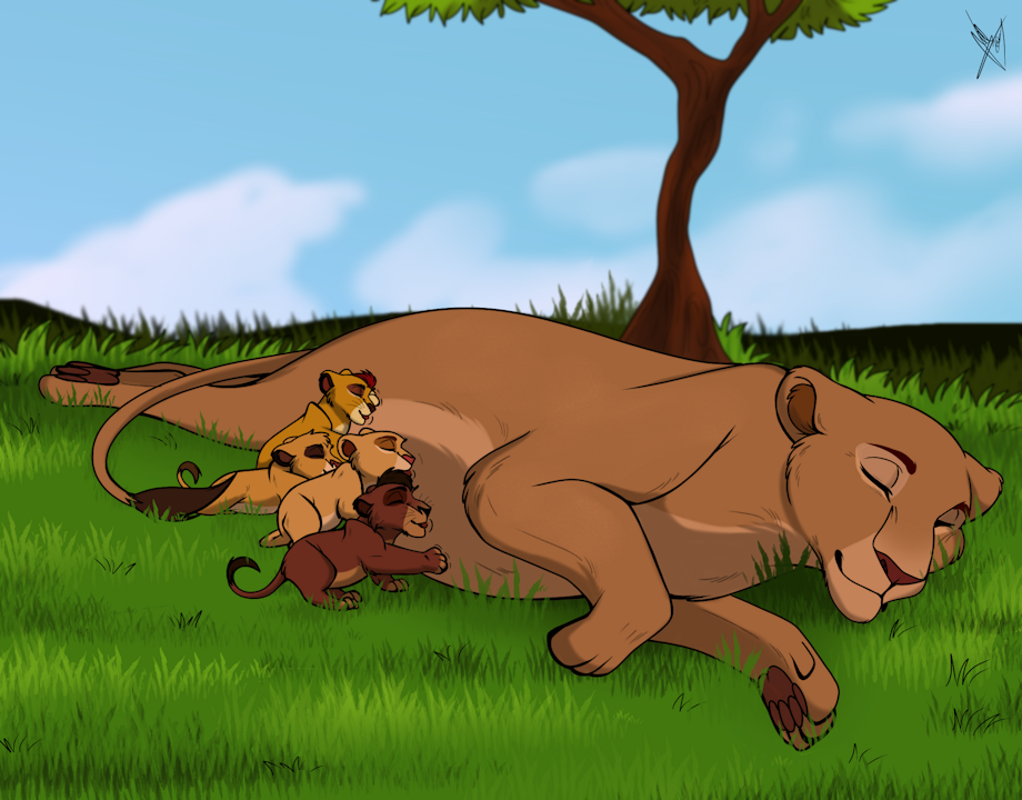 "In a unique twist, when Kiara and Kovu had their fated encounter, Kion and Vitani had also been present during the meeting. When Simba tried to penalize Zira for returning to the Pridelands after being banished, Zira had offered up Vitani and Kovu for Simba to deal out his penalty. Kovu and Vitani were shocked their mother was offering them up to be sacrificed. Then, unexpectedly, Vitani pleaded to Simba not to kill them or hurt them, addressing him as her king. This had given Nala a glimmer of hope in her eyes. The cubs were no older the Kion himself, still in need of a mother's care and nourishment. And it seemed they hadn't bought into Zira's manipulative nature yet. Nala convinced Simba to take the cubs in as their own, knowing it would strike a far greater blow to Zira's personal pride. Zira was obviously not mother material, after seeing how she had twisted her first son Nuka's mind. Simba soon agreed with Nala's advice, and welcomed Kovu and Vitani into the Pridelands, and told Zira she was to resume her banishment, only letting her off with a warning. Now, a couple days later, Nala was resting near the waterhole with her cubs, both her birth cubs and her adopted cubs. All four were having their morning breakfast from her. Vitani and Kovu, she could tell had quite an apatite, as they were really trying to get as much milk as possible. She hated to think how much Zira must have been starving them with how bent on retaking the Pridelands in Scar's name she had been. So, she couldn't blame them if the two kept nursing once Kiara and Kion had their fill. They needed as much nourishment as they could get, a nourishment only a loving mother could provide."