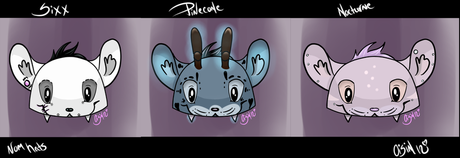 Moar hats. Did one up for Nocturne and Pinecone as well. Pinecone will have glowing ears, teeth, and antlers. I think if Sixx wants, I'll add glow to his piercings.