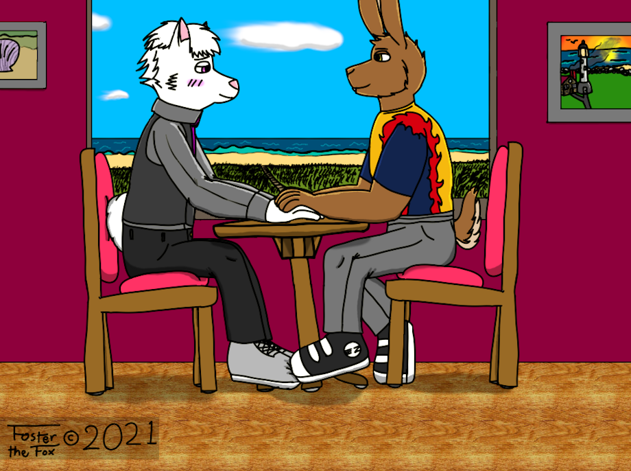 Malcolm chose this coastal seafood restaurant called "Betta's Coastal Gourmets" (or simply as "Betta's") to see the nice coastal scenery of the beach before them while they get some seafood inside. Choosing the table and seats of where the view of beach is before them (that also has path leading towards the beach as well), they ordered their food as they waited. It didn't take to long before his hands were felt on the table by that handsome Hare looking sweetly at him. It caused Malcolm to smile happily as he looked at Fionn before him. Fionn wore a t-shirt version of his superhero costume mostly because he wouldn't want to get sand all over his nice costume when the two will go to the beach later on. He also had some simple, grey sweatpants on while his feet had some shoes from the favorite clothing brand "EZ." Fionn, pretty much seeing how cute this white dog is wearing that simple private detective outfit (grey buttoned shirt, dark grey vest, purple long tie, black jeans, and light grey shoes) on a normal day like this, gently pressed his foot which caused Malcolm to blush, but smile warmly.
