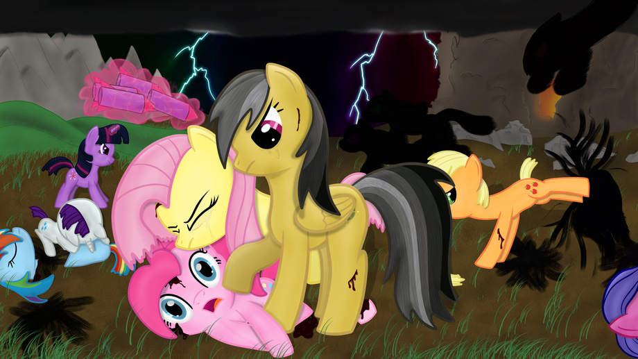 The Mane Six and Daring Do fighting some crappy shadow horse things with a half-assed background.
