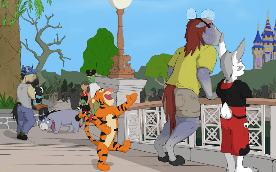Howdy everyone, I decided to start drawing this picture featuring my sonas on a Disney vacation and may make more considering how much I love going to the parks lol. This is a spot from Walt Disney World, it's just off of Main St. USA and is a very good way to skip the foot traffic to Adventure land. It is also the area you can usually run into Pooh Bear and his friends! As a side note, I based alot of the outfits on merch you can get at the parks, not Denny's shorts though.