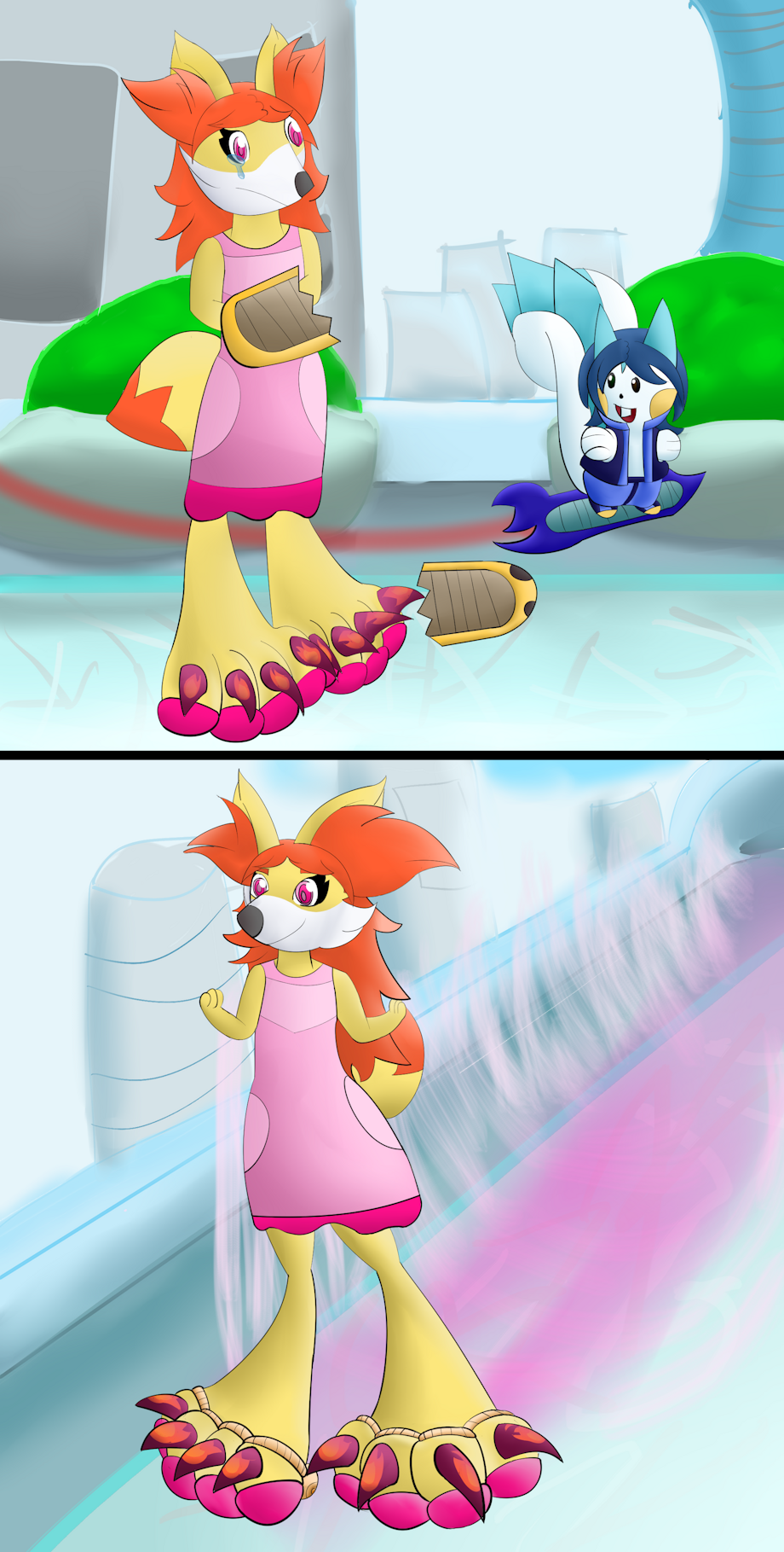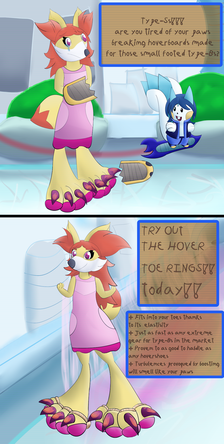 In the 1st age of my universe people liked hover board racing as if it was sonic riders but Type-Ss' paws were so big they couldn't participate and this fennekin cub was lucky enough to get one of the latest inventions of the company that produces hoverboards and hovershoes these toe rings will be revolution for hover board racing