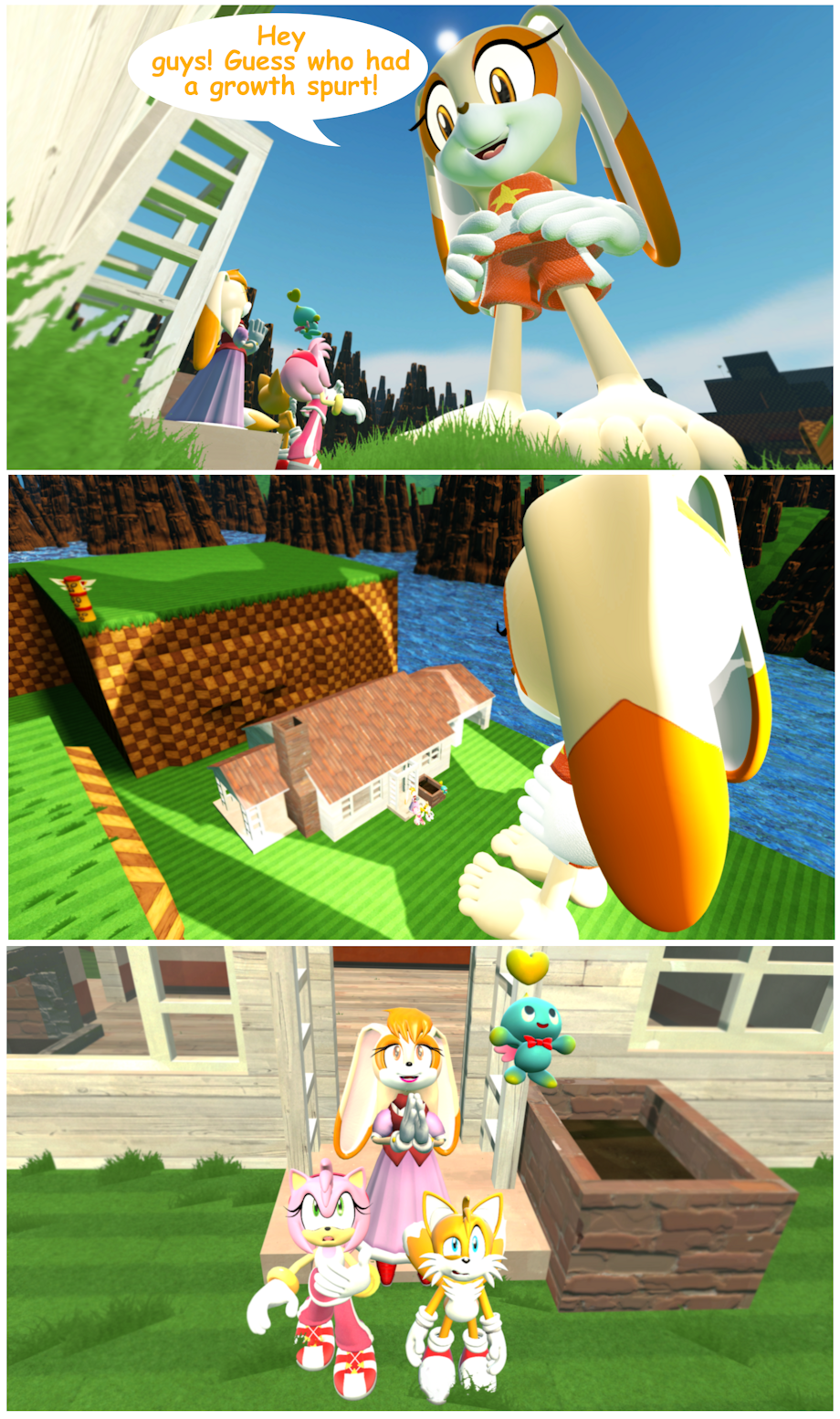Amy and Cream were going to meet up and do some extreme gear riding...but somewhere down the line, Cream found one of Tails's prototype inventions and it turned her into a giantess...Amy and Tails aren't fans, but Vanilla and Cheese couldn't be happier for her.