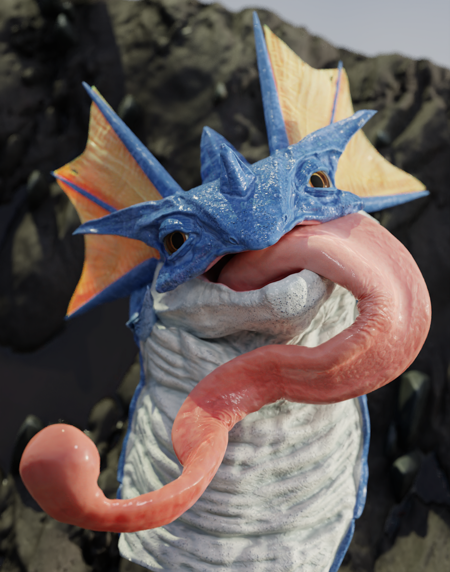It be the Innsmouth dragon from Dragon Tamer (I've already quit that game months ago, but there are some dragon designs I like) Idk if tongue is cannon, but they remind me of frogs... also it's something to practice face & tongue rigging so I'll be more prepared for when I remake Lathanial, my tongue draggy c: