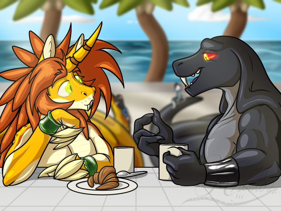 Since we are on Snektember again, I decided to start with something simple and relaxing, showing those little remnants of Summer that still linger around. I asked my friend Tsubaki (at FA) if I could draw his naga guy Rahkzar, and he was happy to lend him for this piece! He is a very big naga so there some macro involved as well, but not the main focus of the piece 😉.