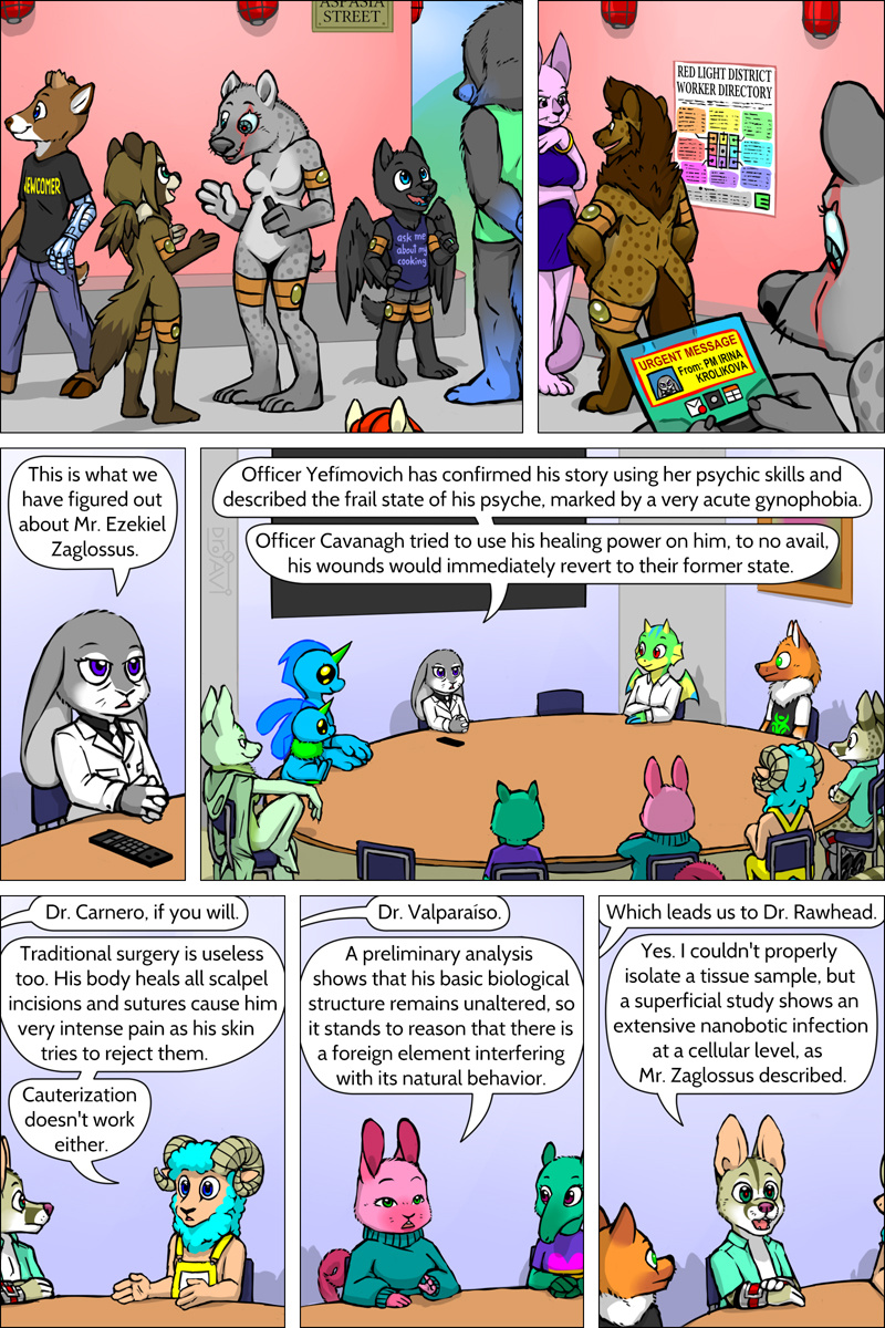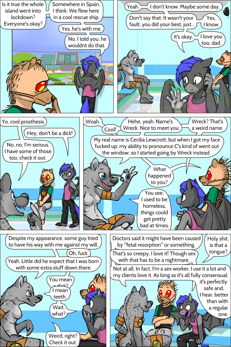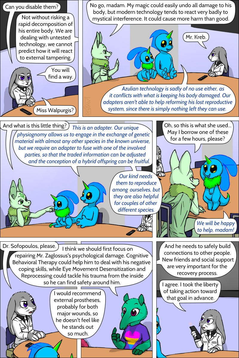 Aww, I missed the updates to this story due to being away.  I'm interested to see how they help with treating Zaggy, first for his psychological issues and then maybe, just maybe, reverse-engineering the technology that constantly heals his body to an undesired default state.  It is difficult when you can't do any kind of surgery because any incisions just instantly self-seal.  Can't get a tissue sample either because, as we've seen, anything that's 'detached' from the body instantly disintegrates and is used to regenerate what's missing.