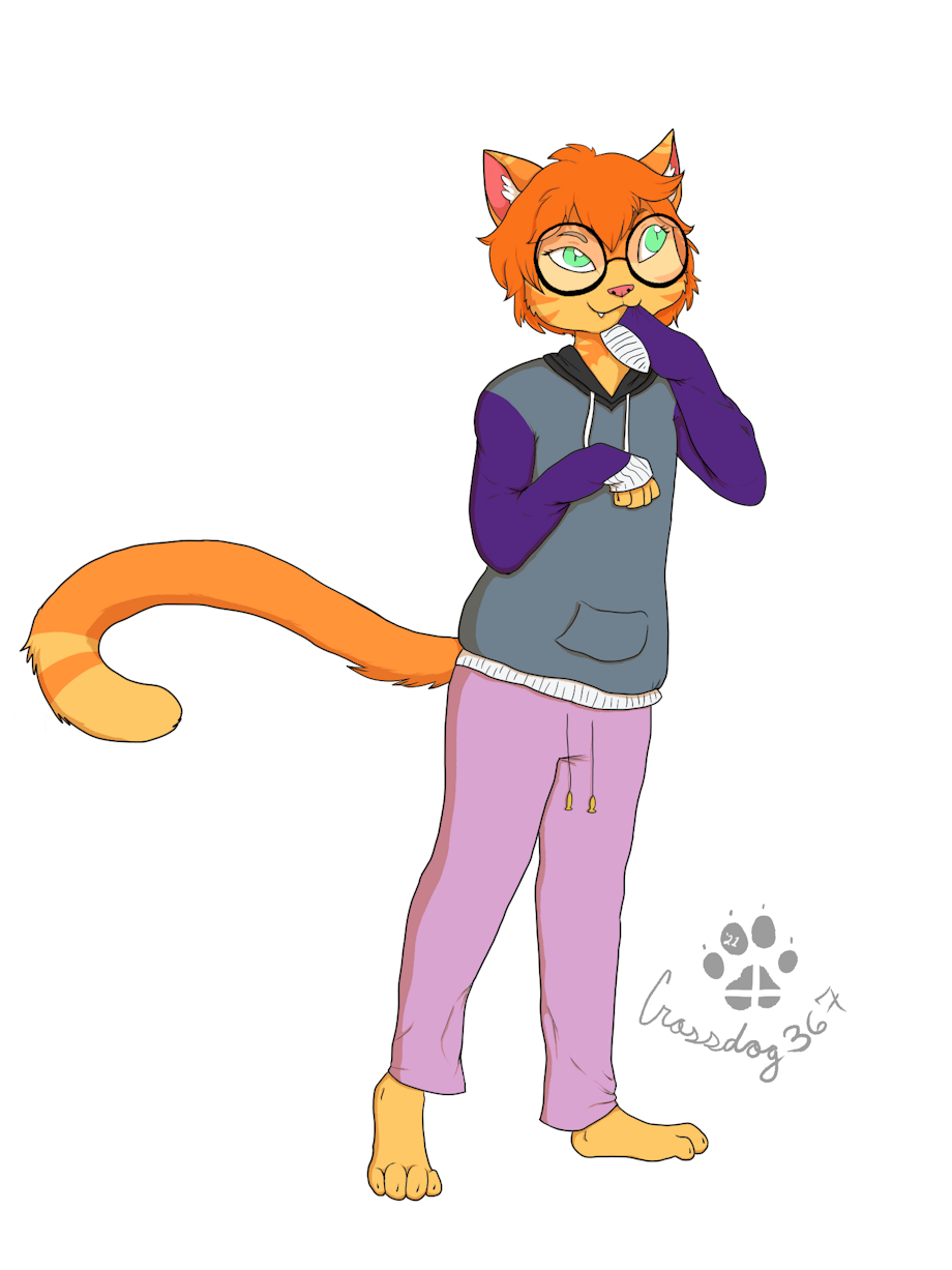 A cell-shaded commission for Terrotchi on Ferzu, their cat character wearing pajama pants.