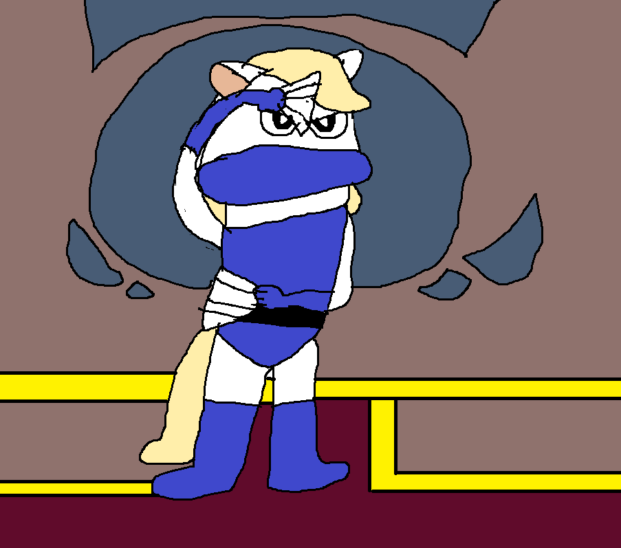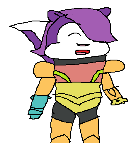 Fifi La Fume wearing Samus' power suit ready to hunt down some Metroids.