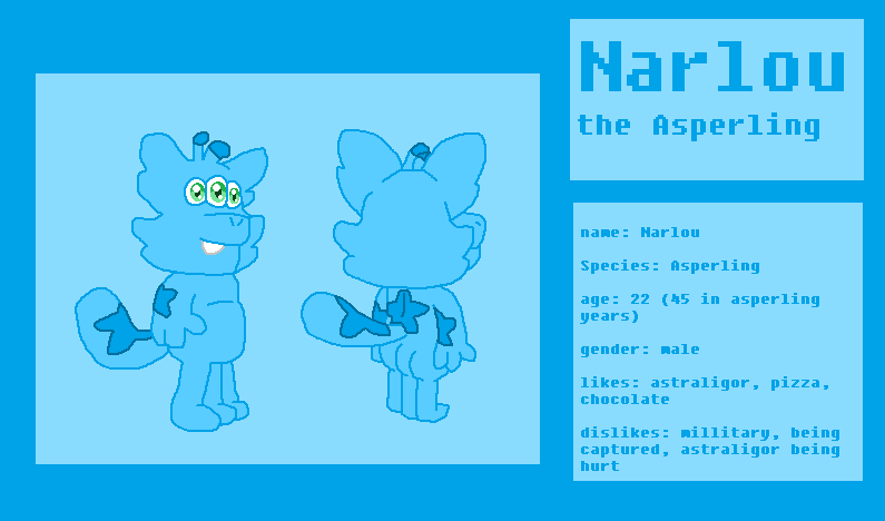 narlou is an asperling that came from Asperlia-205, he came to adventurion to find a better place to hide from alien hunters of his home planet. when he met astraligor, the two became friends and nothing can break their friendship. in animalianese nar means space and lou means friend, that when narlou was named since then.