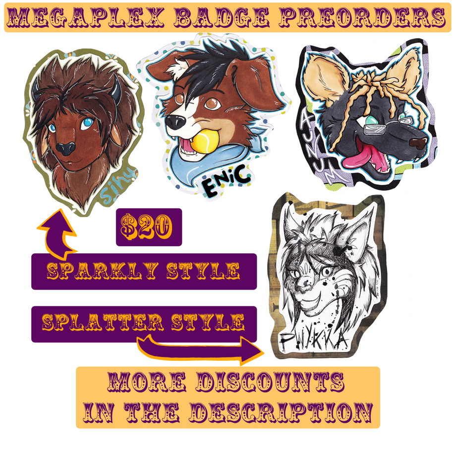 Super Awesome Commissioner Special Order a large, color commission and get a badge for $13! That means you can get full body, full color art of your character and an awesome badge to wear at the con for as low as $40! This special is only available as a preorder for the convention!