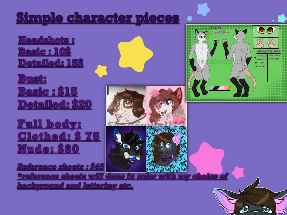 figured it was about time i posted something regarding commissions because yes! i DO do them im just really bad at advertising for them. ill have a nsfw version of my prices listed soon as i get it made up.