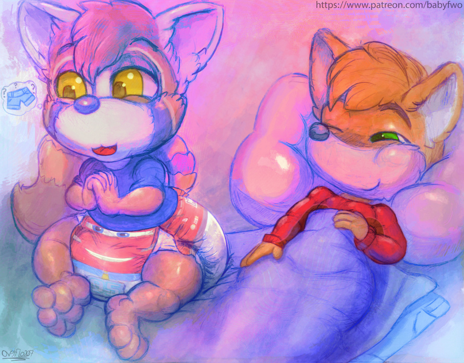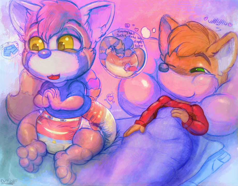 Reward for Friendly Who wanted his two cute furry boys, having a sleepover. Of course only one of the two are actually still pampered, and so Friendly fox just had to see what his best friend Timothy looked like, in said poofy pampers. Cuz Timothy never shows more than his waistband, but his bestie is determined to see what silly cartoony print he has. He knew he liked Disney's Cars, but never expected him to wear the diaper of his favorite show. XD Whatta baby. ;^@^