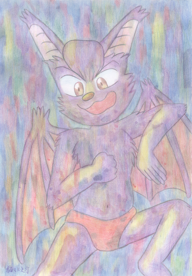 he is my demon boy character Maya with pink colored background. I paint this art in 2013 and I think the yellow is well used and it make a light effect, and I like his pose and it have a kind of perspective. I feel his blue fur fit with the pink colors.