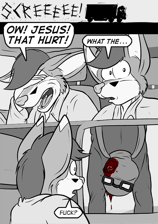 >SCREEEECH CRUNCH<..,"Hey, hotshot, your fault. You rear ended me. I didn't want to run over that raccoon that crossed in front of me. I hope you got good insurance. You scratched my trailer bumper. It's going to be costly to match up the paint".